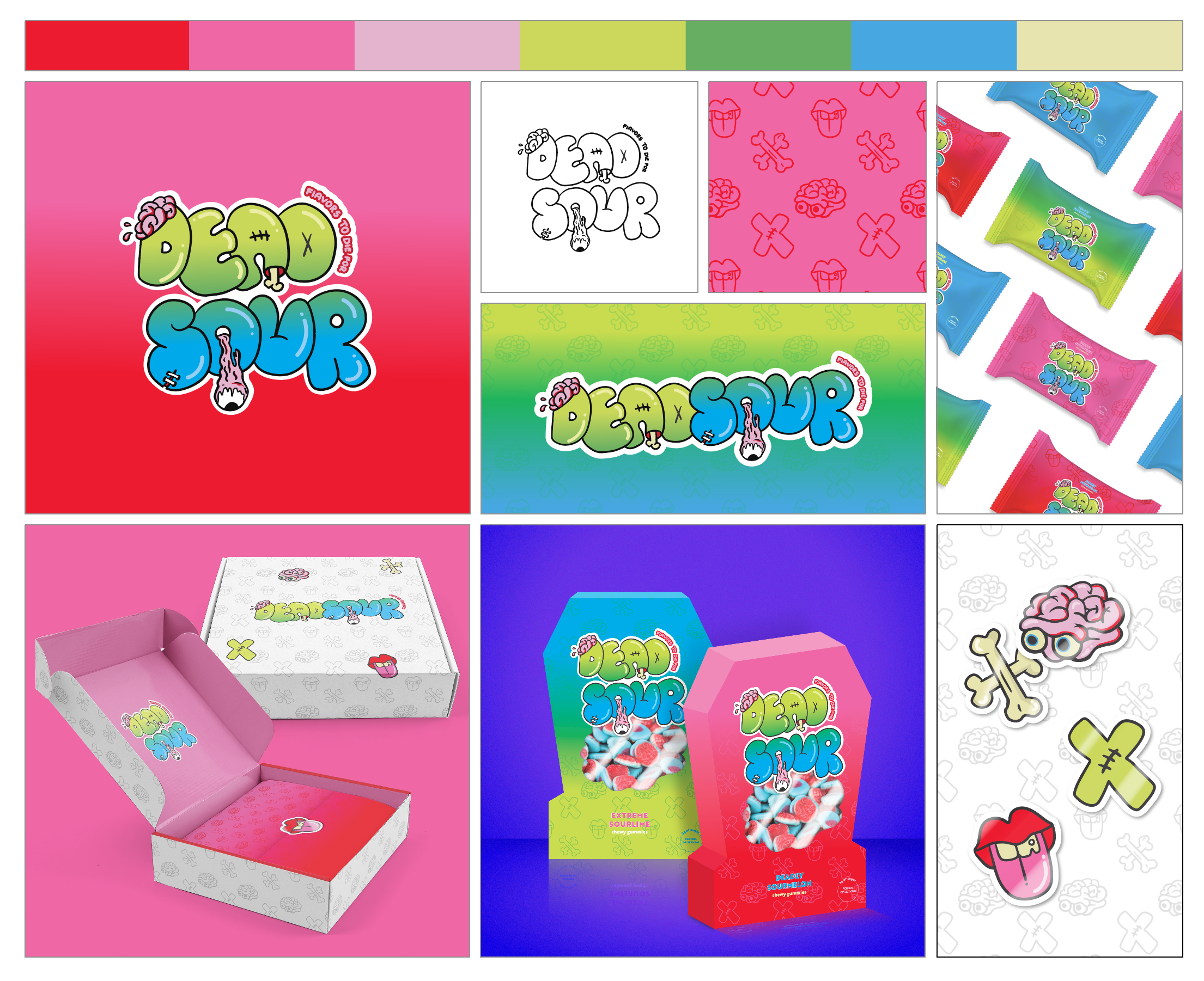 a mouth watering sour sweet business that has voted #1 extreme sour sweet brand! they offer a huge range of flavors. I designed everything from the logo to the packaging to the illustrations. As with its flavors, I wanted this brand to be bright and bold. To make the product stand out from the competition, I chose a very non-traditional logo inspired from sour patch kids and the Trolli logo.